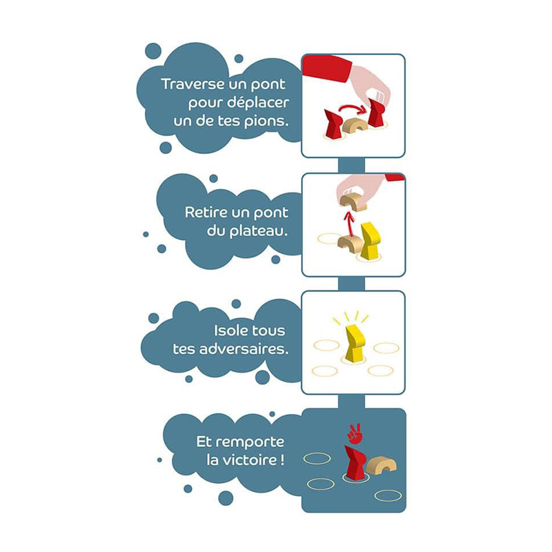 Jouable de 2 à 4 joueurs, ce jeu de réflexion vous obligera à isoler tous les lutins adverses pour les empêcher d’emprunter les ponts qui les entourent.