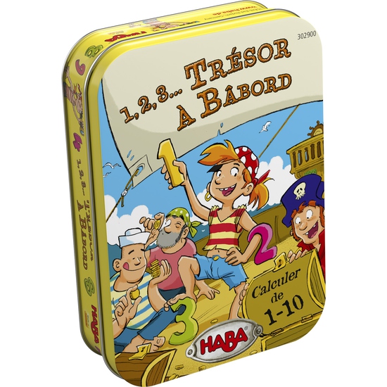 1 pirate Soraya, 1 dé, 20 cartes de chiffres, 10 cartes d’exercices, 5 cartes vierges, 1 carte Plus/Moins, 1 réglette avec chiffres (à assembler), 1 règle du jeu.