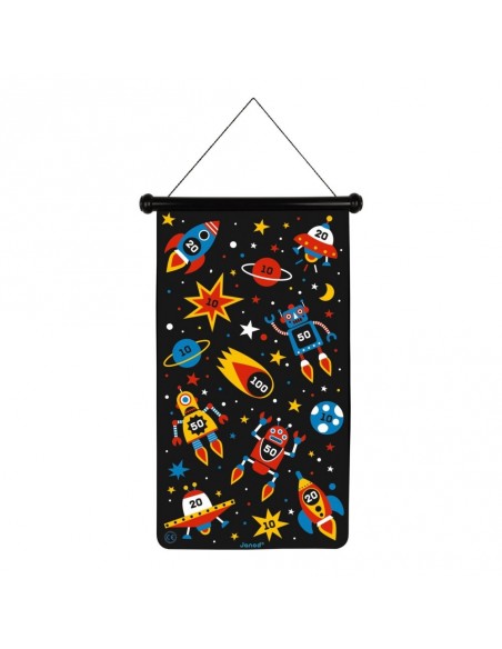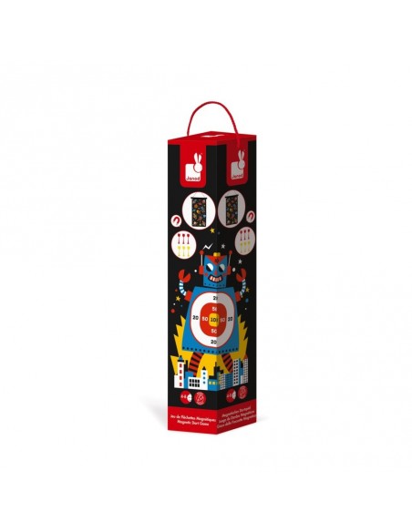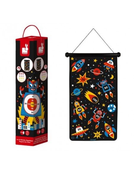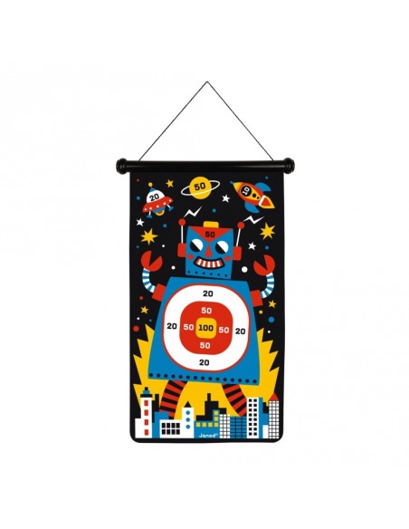 Découvrez le jeu de fléchette magnétique robots de Janod, un jeu réversible sur le thème des robots de l’espace, livré avec 6 fléchettes en plastique (3 rouges et 3 jaunes) et équipé d’une ficelle en coton pour le suspendre. Pour les enfants de 4 à 8 ans.