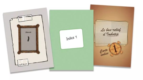 Si vous éprouvez des difficultés, des cartes indices à disposition : pour chaque tableau, 6 cartes indices sont disponibles, à retourner dans leur ordre de numérotation. Mettez votre égo de côté, elles sont là pour vous aider !