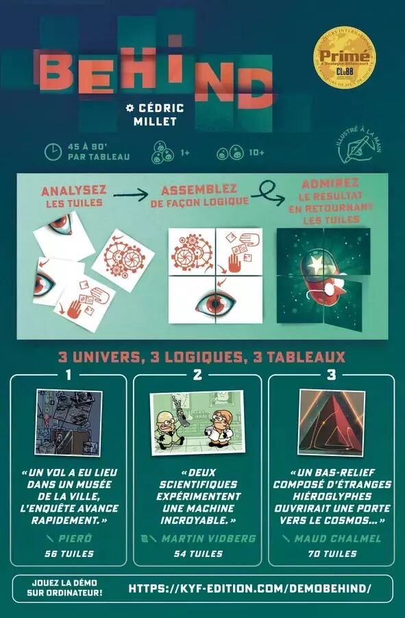 As d’Or 2025 Initié… 3 univers, 3 logiques, 3 tableaux ! Behind est un jeu d’ambiance mélangeant énigme, déduction et tuiles à assembler comme un puzzle. Dans ce jeu de société original, retrouvez 3 tableaux à assembler : faîtes preuve de logique en assemblant les tuiles et révélez une histoire, une énigme dans 3 univers bien différents. Analysez, Assemblez, Admirez !
