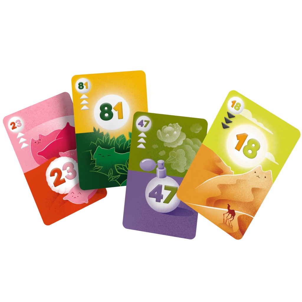 Chaque carte représente un nombre compris entre 1 et 90, illustré par d’adorables chats cachés dans des décors colorés. À votre tour, vous devez jouer une carte — ou un groupe de cartes — en respectant une contrainte simple : le nombre joué doit être plus grand ou plus petit que celui imposé par le joueur précédent.
