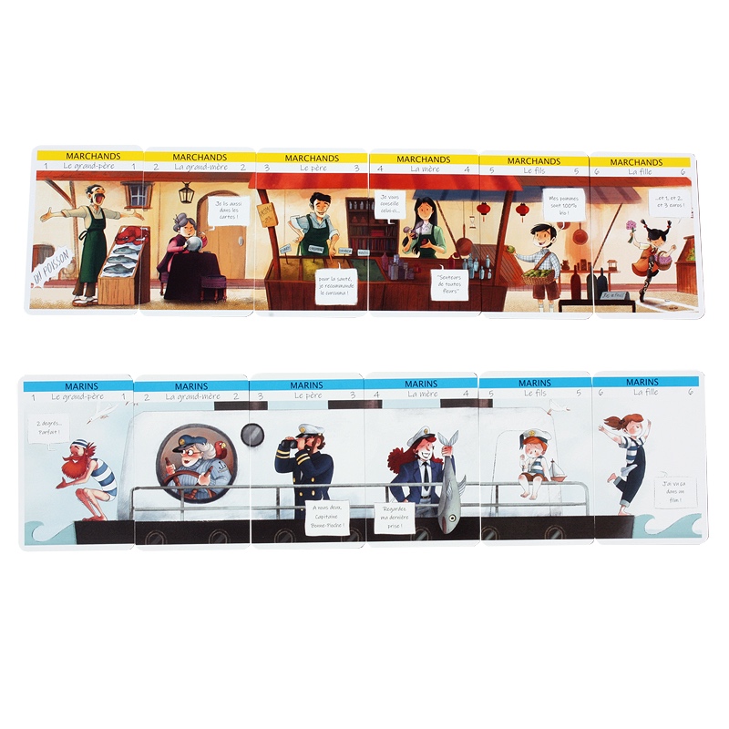 Un superbe jeu de 7 familles Tradition, classique et d’une grande élégance, avec les familles Montagnards, Marins, Marchands, Musiciens etc… que l’on tente de compléter avant de pouvoir les placer devant soi sous forme de frise humoristique genre BD. Un régal pour les enfants et les adultes qui les accompagnent !