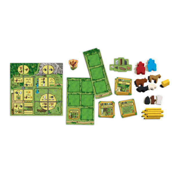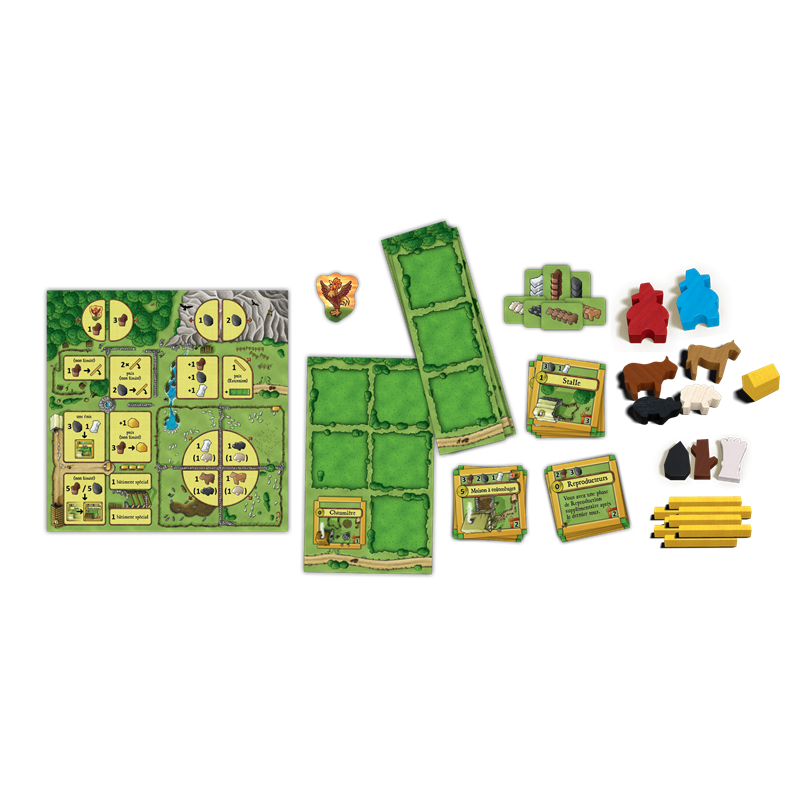 Contenu : 1 plateau de jeu, 2 plateaux de ferme, 5 extensions de ferme, 5 tuiles Stalle/étable, 4 bâtiments spéciaux de base, 54 bâtiments spéciaux, 9 marqueurs de substitution, 1 marqueur 1er joueur, livret de règles.