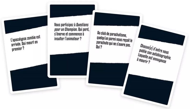C’est très simple : à votre tour, vous piochez 1 carte avec 1 question, puis tout le monde vote pour la réponse. Vous devez désigner quelqu’un. Vous ne pouvez pas vous désigner vous-même.