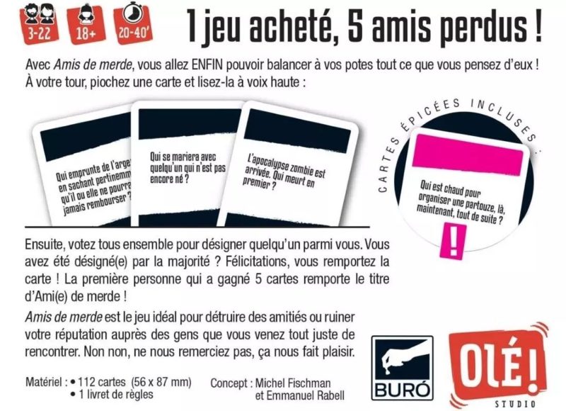 Amis de merde… plus tu joues moins t’as d’amis ! Le jeu parfait pour briser des amitiés de longue date, gâcher une réunion de famille, semer la zizanie dans les couples ou ruiner toute chance de faire bonne impression auprès de quelqu’un que vous venez de rencontrer. Mais c’est surtout un bon jeu d’ambiance ou vous devez répondre à des questions complétement décalées … pour jouer entre amis pas trop suceptibles !