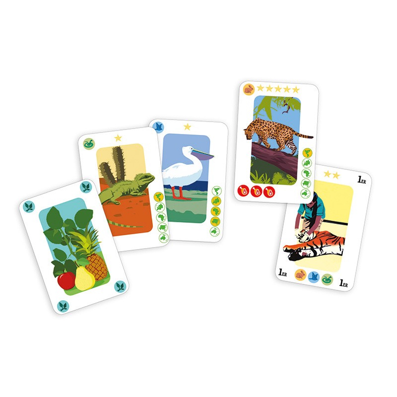 Sur chaque carte Animaux on trouve de petits pictogrammes représentant son type (terrestre, maritime ou aérien), son régime alimentaire (carnivore, végétarien ou omnivore) et son continent d’origine.
