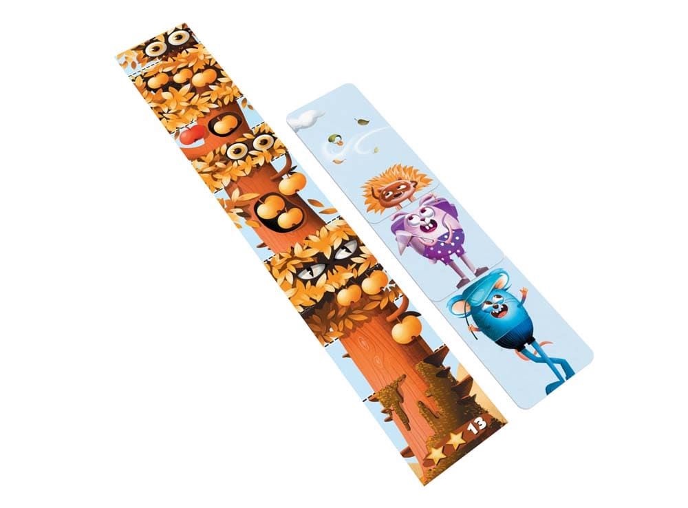 À tour de rôle, les joueurs vont poser des animaux de leur main pour créer des tours. Chaque joueur peut contruire jusqu’à 3 tours. À son tour un joueur doit : – Sélectionnez un personnage de sa main, – Le placer devant lui pour créer une nouvelle tour, ou l’ajouter à une tour existante – Refaire sa main à 4 cartes. Une fois que tout le monde a joué 9 carte Personnage on passe à la récolte des pommes. Les joueurs vont comparer le somment de leur tour avec le mètre Arbre. En fonction de la hauteur qu’ils ont atteint ils gagneront des pommes, mais attention aux prédateurs. Chaque animal a une capacité qui lui permettra de récolter plus de pomme, de ne pas être affecté par les prédateurs.