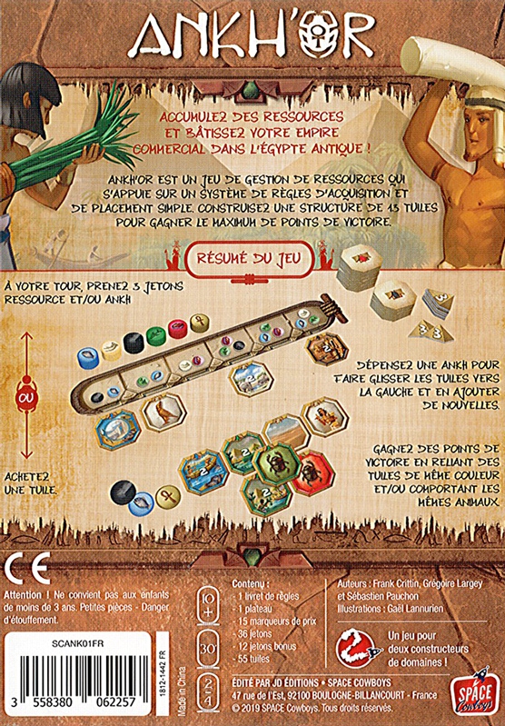Ankh’or est un jeu de gestion de ressources qui s’appuie sur un système de règles d’acquisition et de placement simple. Vous devrez tenter de collecter, chacun votre tour, 3 types de jeton et construire une structure de 13 tuiles pour gagner le maximum de points de victoire en connectant les tuiles de la même couleur. Vous pourrez également déplacer les ressources du marché pour faire baisser leurs prix.