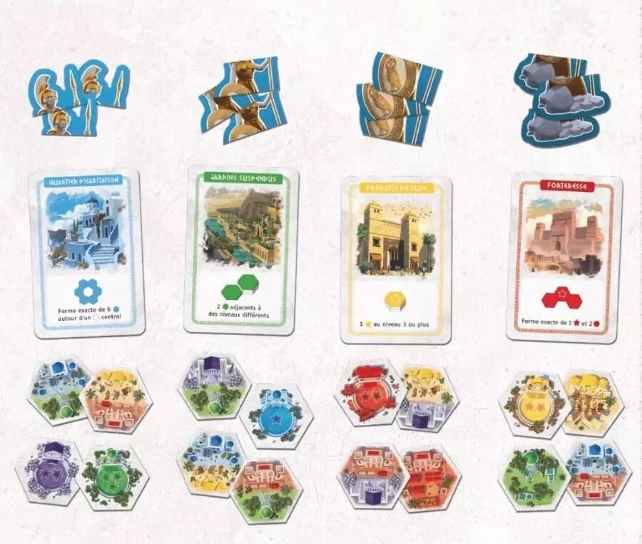 Contenu : 30 mini-tuiles, 18 cartes construction, 4 statues d’Athéna, la règle du jeu.