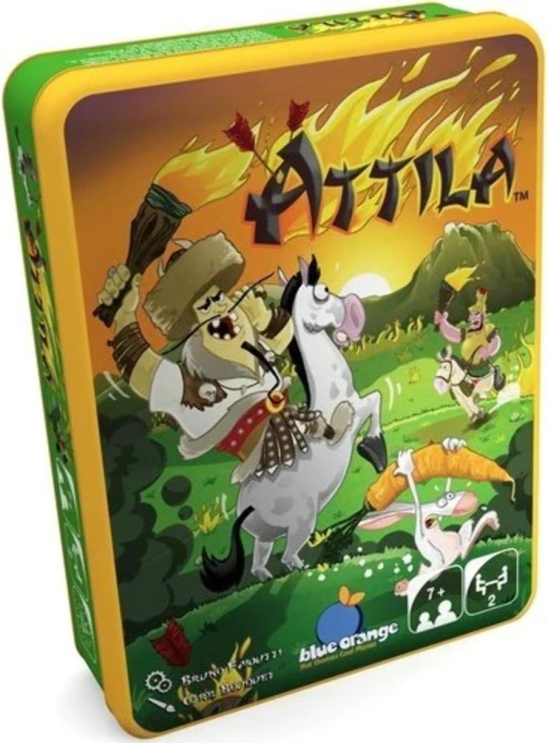 Attila est un jeu pour deux joueurs signé Bruno Faidutti (l’auteur de Citadelles et Mascarade). Chaque joueur possède 3 cavaliers, qui se déplacent comme aux échecs. Le principe consiste à déplacer un cavalier et condamner une case à chaque tour de jeu. Le but du jeu est d’éviter de se faire bloquer. Si un joueur se retrouve totalement bloqué, son adversaire gagne la partie. Attila est un jeu de réflexion simple en règle et très malin à jouer. On peut aussi le voir comme une initiation aux Échecs, non seulement pour le mouvement du cavalier qui est le plus particulier du jeu, mais aussi pour la notion de contrôle de l’espace.