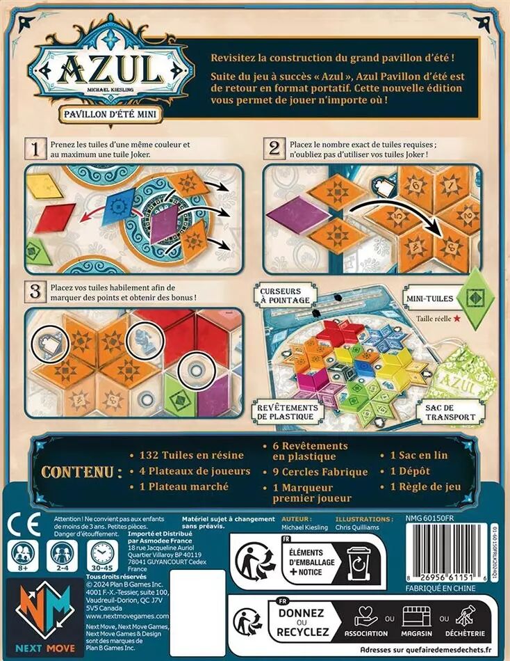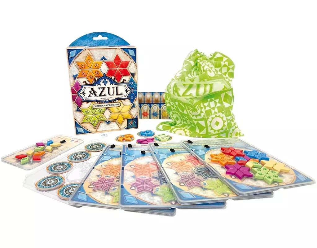 Dans Azul Mini Pavillon d’été, les joueurs ont pour tâche de garnir les planchers du pavillon d’été selon les volontés du défunt roi, Manuel 1er. Ce bâtiment est érigé pour honorer les membres prestigieux de la famille royale du Portugal. Les fans reconnaîtront immédiatement la mécanique de draft d’Azul, mais seront intrigués par la nouvelle façon de marquer des points basée sur l’assemblage de motifs de tuiles. La nouvelle forme des tuiles permet maintenant de créer de magnifiques motifs en étoile sur votre plateau joueur. Vos yeux, ainsi que votre esprit, se régaleront d’Azul Mini Pavillon d’été dans ce format nomade !