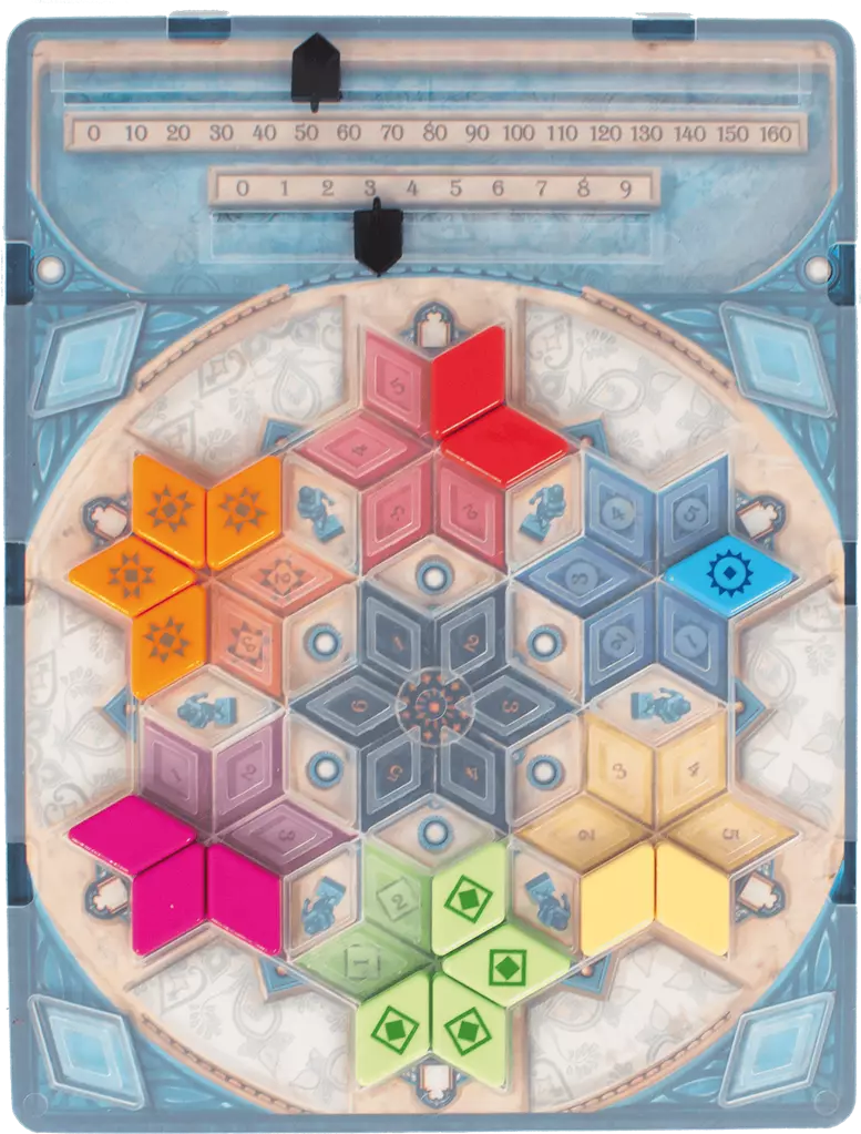 Contenu : 132 tuiles en résine, 4 plateaux de joueurs, 1 plateau nmarché, 6 revêtements en plastique, 9 cercles fabrique, 1 marqueur premier joueur, 1 sac en lin, 1 dépôt, 1 règle de jeu.