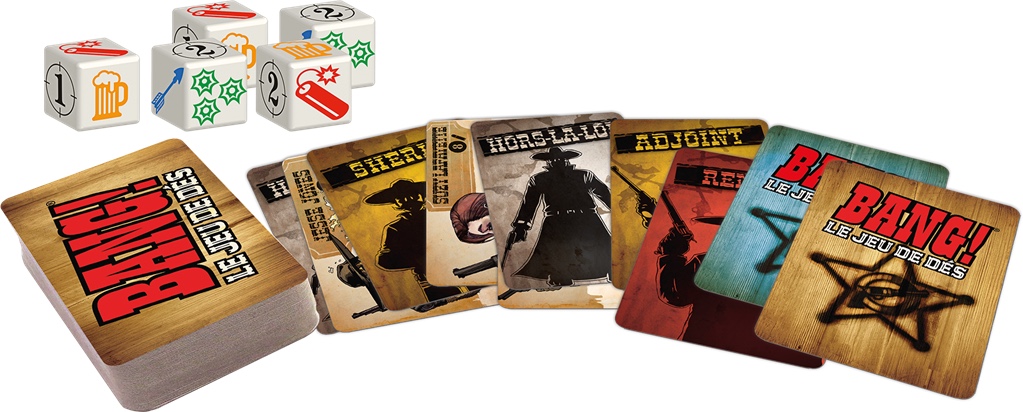 Un jeu complet et indépendant inspiré du célèbre jeu de cartes Bang !  Dans Bang ! le jeu de dés, la lutte est acharnée entre le shérif, les hors-la-loi et le renégat. Chacun veut éliminer le clan adverse et les balles fusent de partout ! Méfiez-vous des Indiens et de la dynamite, et ne vous trompez pas d’ennemi, car les rôles sont secrets sauf celui du shérif… Et si malgré tous vos efforts, vous êtes à moitié mort, rien de tel qu’une petite mousse pour ne pas finir en bière !
