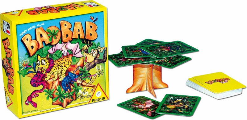 Baobab est un jeu d’adresse et d’équilibre dans lequel il faut empiler des cartes sur le tronc d’un arbre en faisant bien attention à ne rien faire tomber. D’expérience, marcher un peu trop vite sur un sol en parquet à côté de la table de jeu, peut faire évoluer le cours de la partie !
