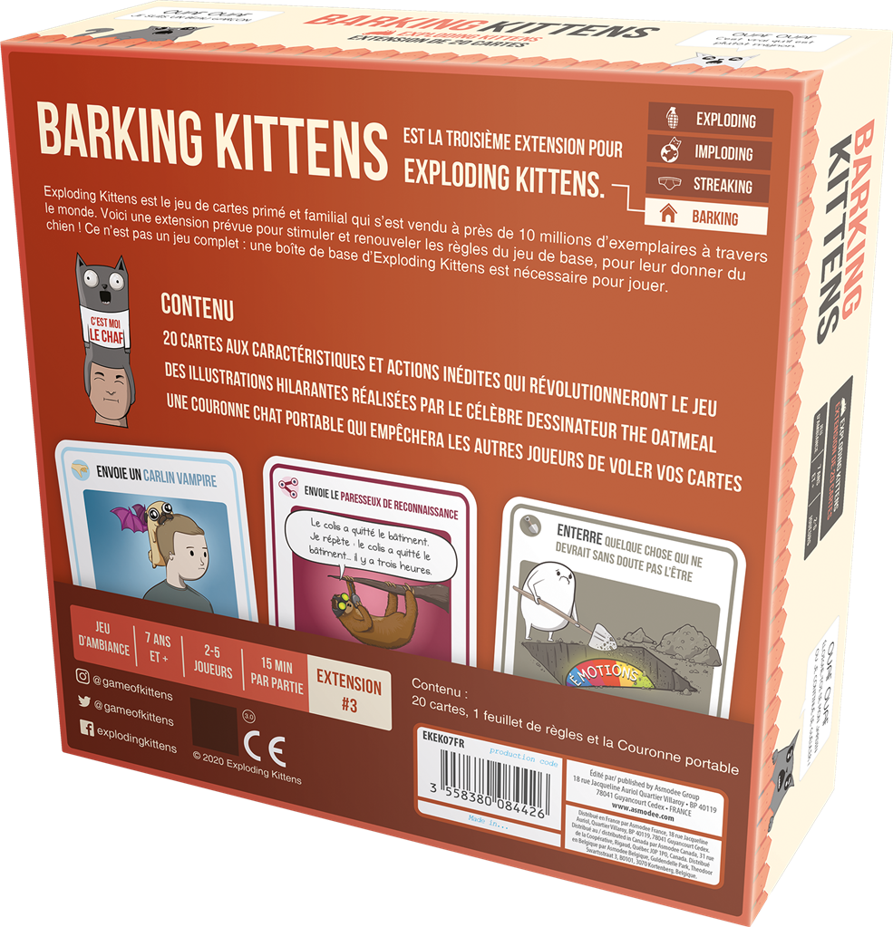 Barking Kittens est une extension du jeu Exploding Kittens qui introduit 20 nouvelles cartes, ainsi qu’une Couronne, qui n’est pas une collerette de la honte (ouf !).