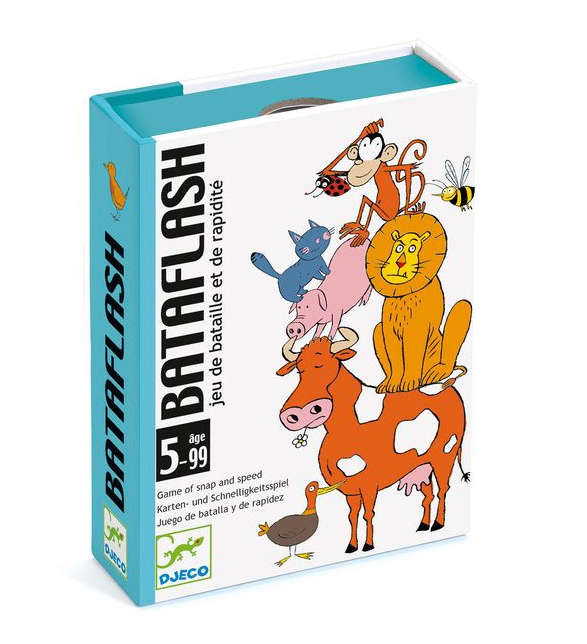 Bataflash est un jeu d’observation et de rapidité dans un méli-mélo d’animaux. Pour être le premier à trouver l’animal en commun à toutes les cartes, il faut avoir l’oeil. S’il n’y a aucun animal commun, il faut crier « Bataflash » pour gagner les cartes. Le premier à récupérer toutes les cartes du jeu gagne la partie. Ce Jeu de bataille et de rapidité est parfait pour développer le sens de l’observation des plus petits.