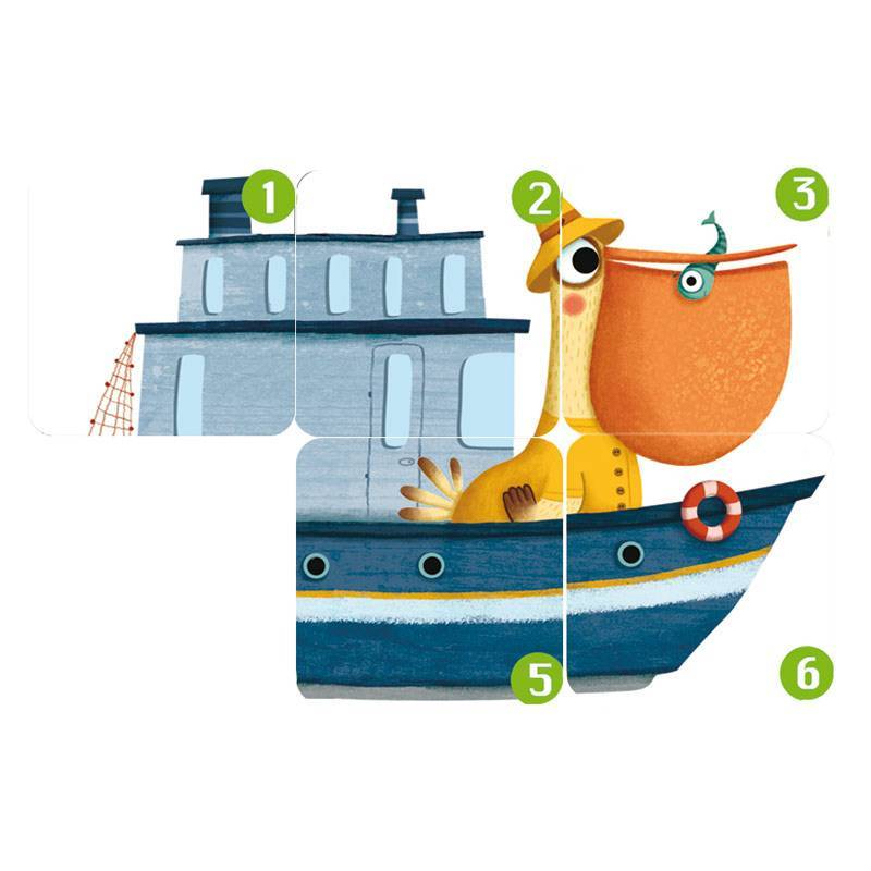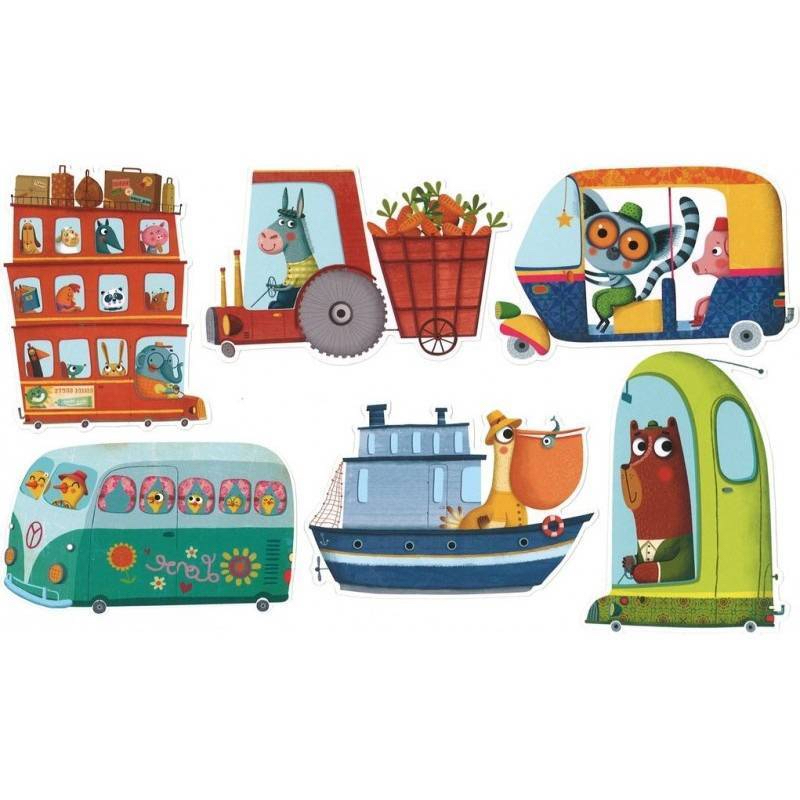 Les cartes du jeu représentent des morceaux de puzzles de véhicules rigolos et sont numérotées de 1 à 6.