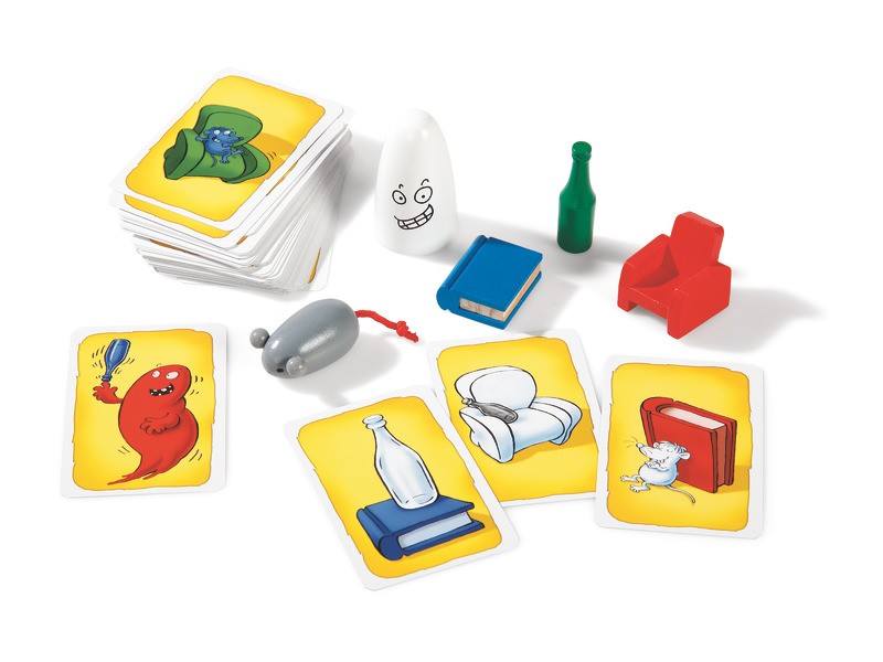 Contenu : 5 pièces en bois : fantôme, fauteuil, bouteille, livre et souris, 60 cartes représentant chacune 2 de ces objets, règle du jeu.