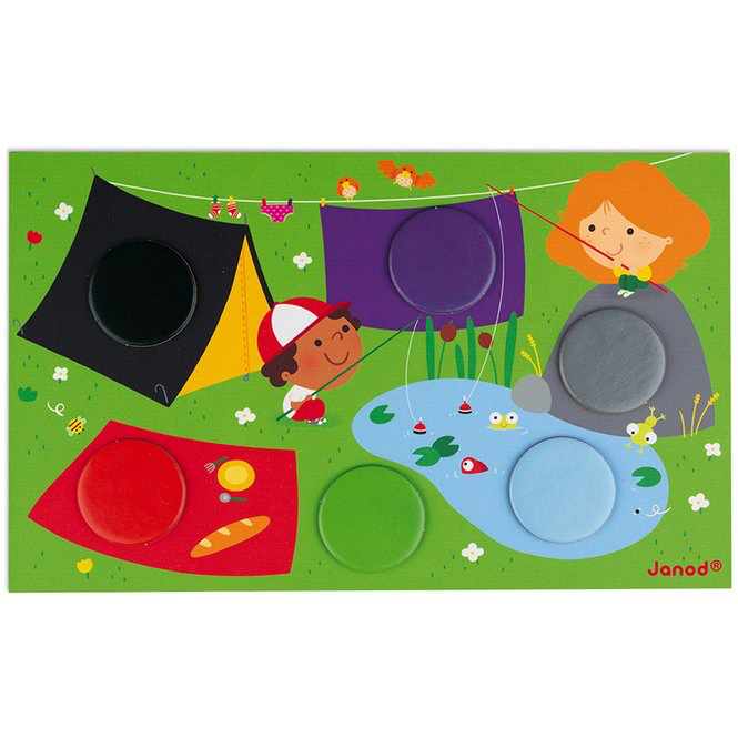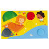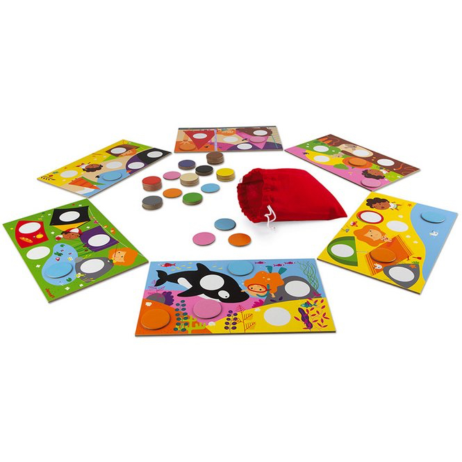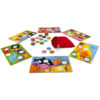 Chaque joueur sélectionne parmi les 6 cartons celui qu’il doit remplir le plus rapidement pour gagner. Les cartons sont composés de 2 faces : l’une pour les tout-petits, à compléter par des jetons colorés, et l’autre pour les plus grands, où les jetons reconstituent une scène.