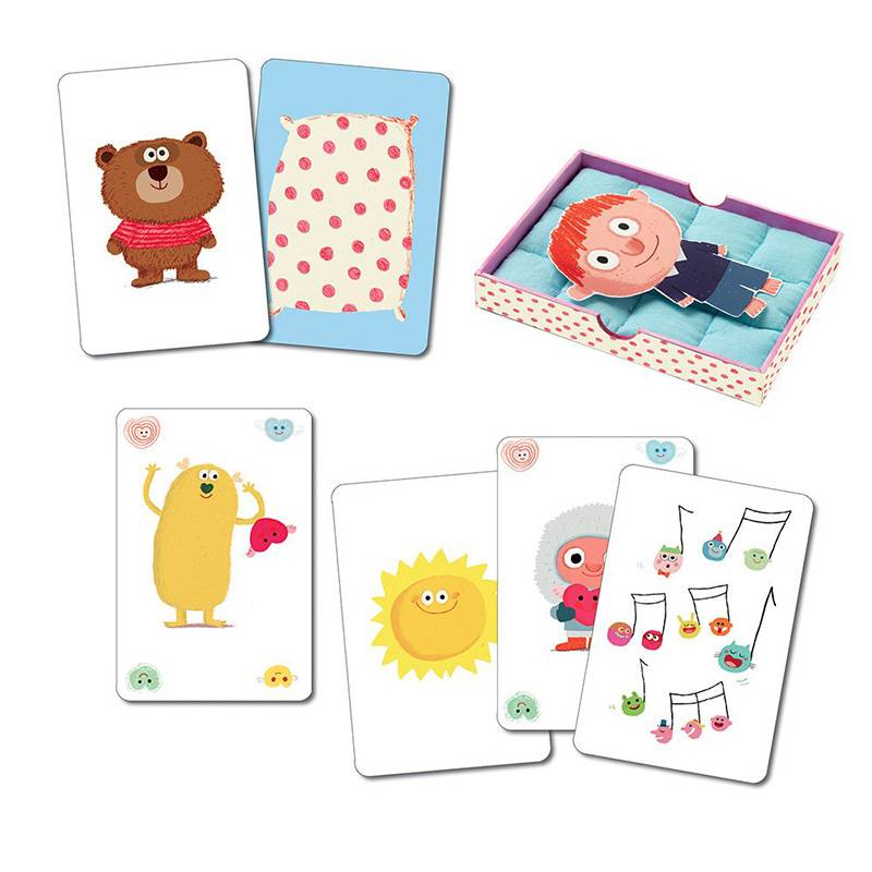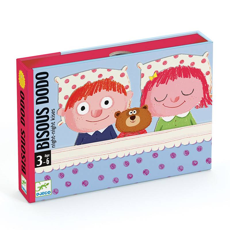 But du jeu :  Avant d’aller dormir, on place le personnage de son choix (garçon ou fille) au fond de la boîte qui devient un lit avec son petit matelas. Pour réussir à s’endormir, il faut retrouver l’oreiller, la couverture et le doudou parmi les cartes. La partie s’arrête lorsque ces 3 cartes sont réunies. Les cartes actions qui ont été retournées pendant la partie deviennent des actions à réaliser : câlins, chatouilles, bisous, petites chansons… Bonne nuit !