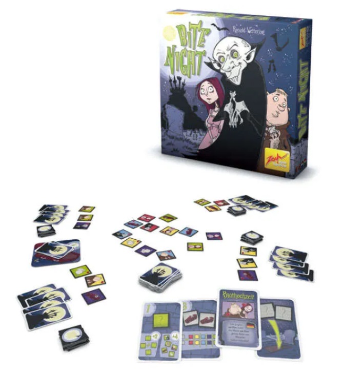 Contenu : 50 tuiles de lune ; 72 cartes Rendez-vous (dont 36 cartes de base) ; 1 carte Premier joueur ; 1 plateau recto-verso (cercueil / cimetière) ; 1 bloc de scores ; règle du jeu.