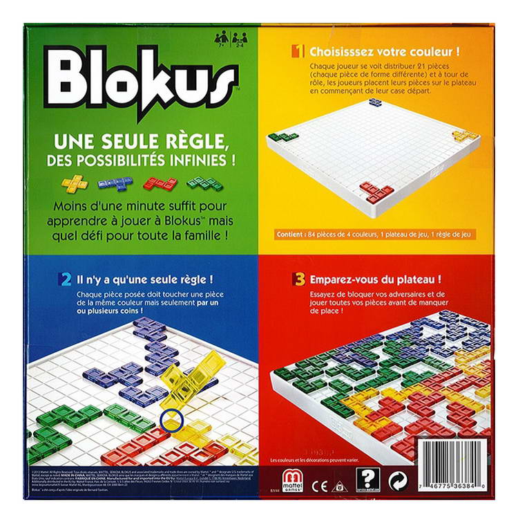 Un jeu de stratégie accessible à tous, dès 7 ans. Un double objectif : placer l’ensemble de ses pièces de couleur sur le plateau tout en bloquant l’adversaire.