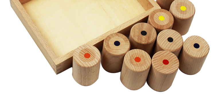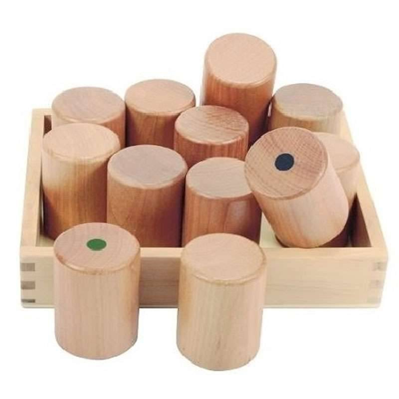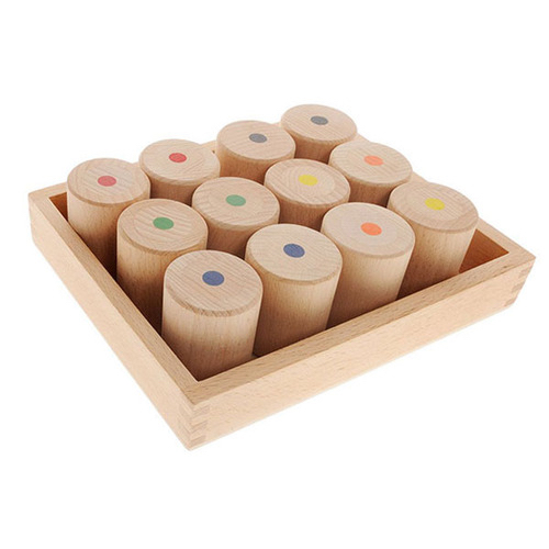 La Boîte à Poids de Beleduc, avec ses 12 cylindre en bois, permet d’identifier 2 poids identiques et d’ en reconstituer les 6 paires.