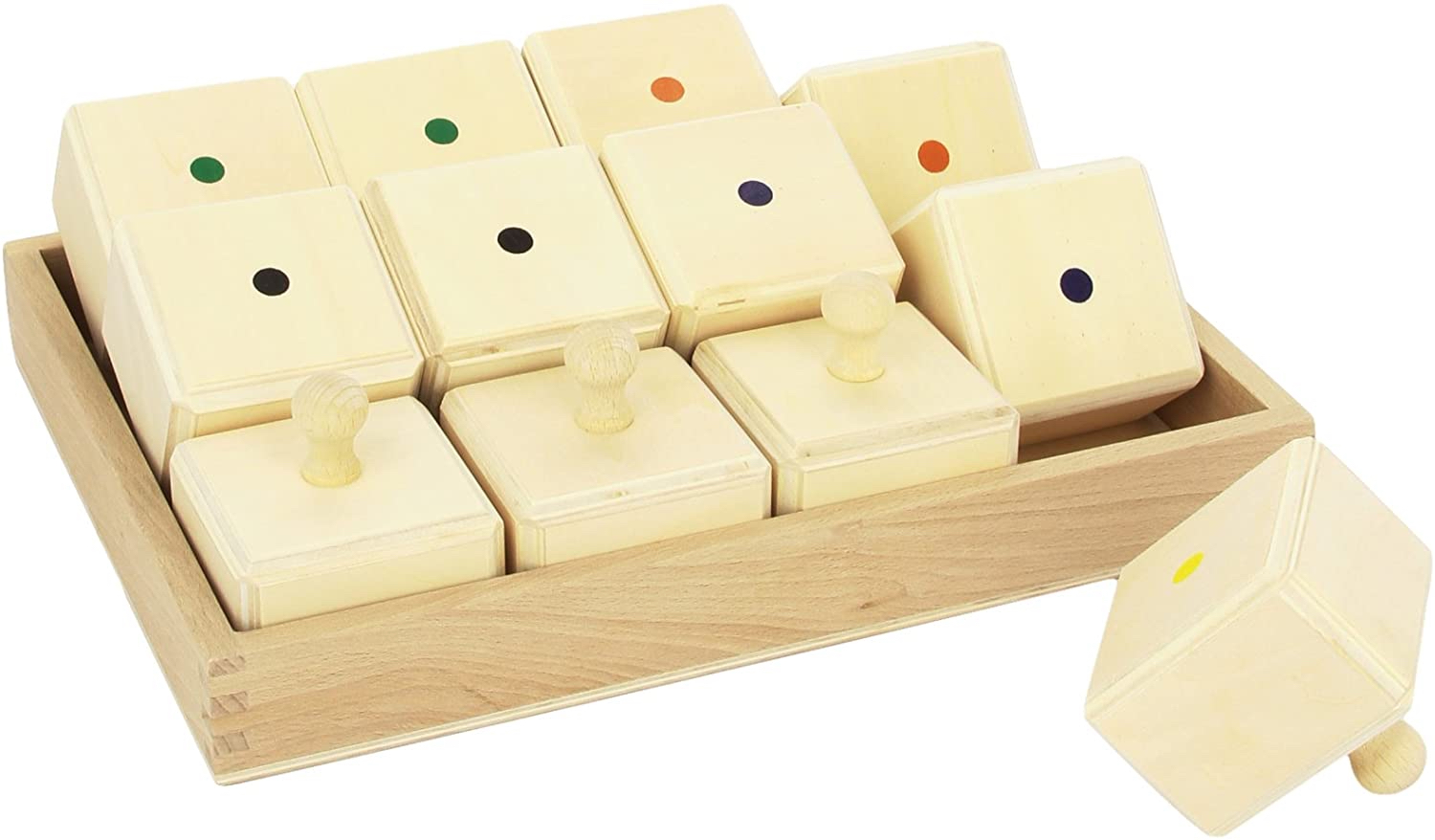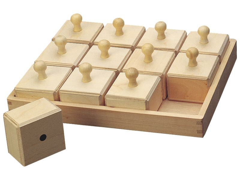 Il s’agit d’identifier 2 sons identiques et de reconstituer les paires sonores. Chaque boîte possède un bouton pour une meilleure préhension et manipulation. Autocorrectif, car marquée d’un signe distinctif de couleur : 2 sons identiques possèdent le même signe sous la boîte.