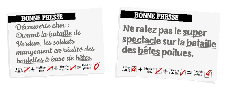Le Rédac’chef valide ensuite les titres qui entrent bien dans le thème du journal : ceux-ci marqueront un point par mot pioché qui a été utilisé. Puis, il attribue des récompenses au titre le plus drôle, et tout simplement au meilleur titre !