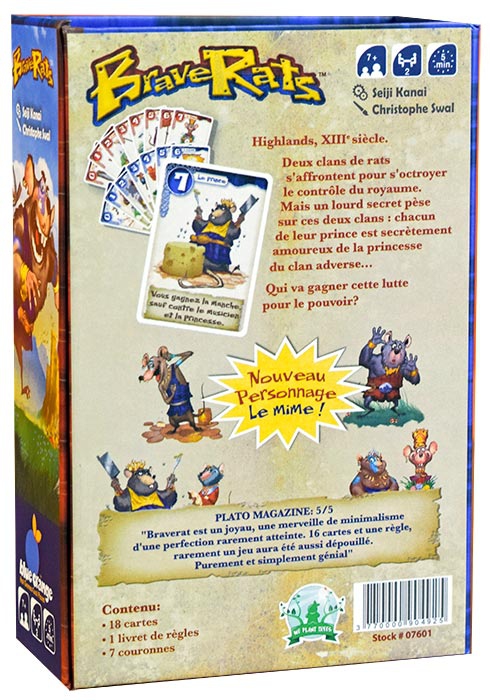 Deux clans de rats – les Yarg et les Applewood – s’affrontent pour s’octroyer le contrôle du royaume. BraveRats est un jeu de cartes et d’affrontement, très simple et malin, pour 2 joueurs. Une « bataille » avec des cartes aux effets puissants et variés ! Dès 8 ans.