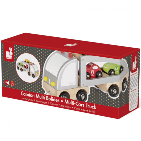 Votre enfant adore les voitures ? Découvrez le grand camion en bois Multi-bolides de Janod qui transporte 3 petits bolides. De quoi imaginer de belles courses de voitures et des voyages à travers les circuits du monde entier.