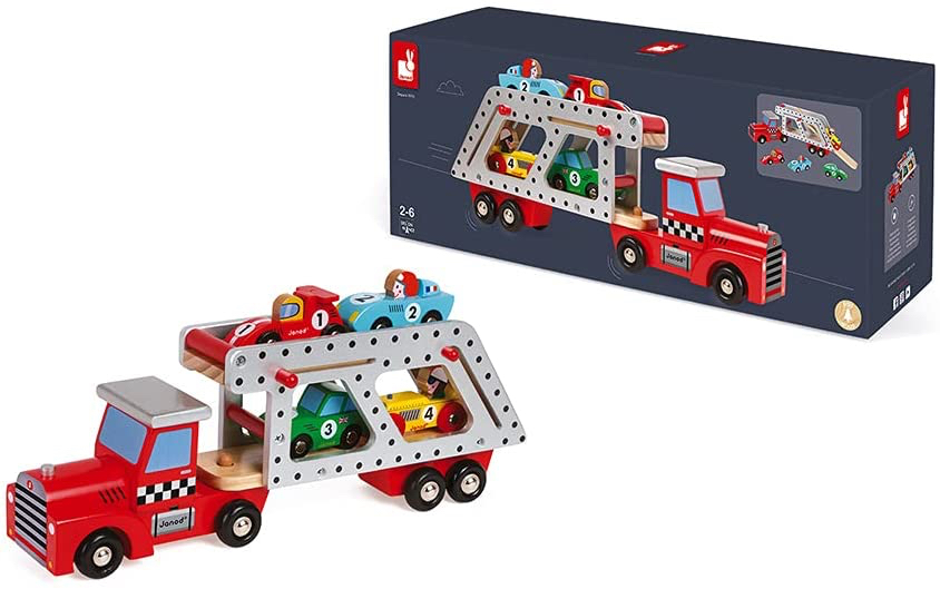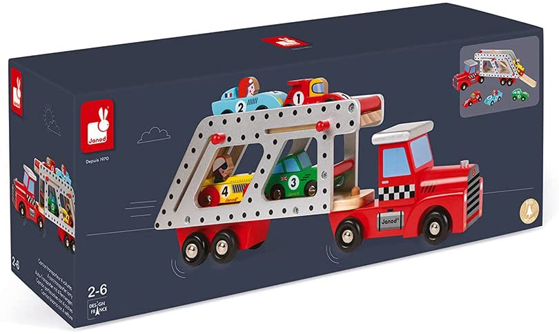 Camion Porte-Voitures de Janod. Ce joli camion en bois peut transporter jusqu’à quatre voitures Story Racing. Sa remorque peut accueillir 2 voitures sur chaque niveau.
