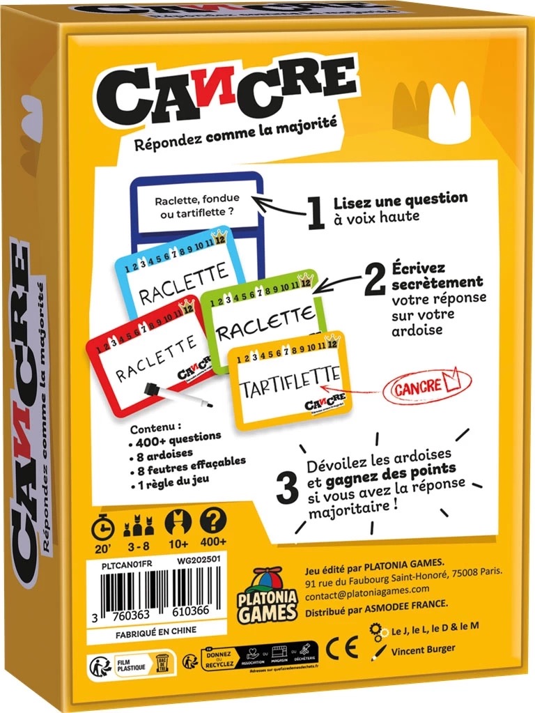 Cancre… Un jeu d’ambiance où vous devrez répondre comme la majorité ! Répondez bien et surtout évitez la sanction en devenant le Cancre.