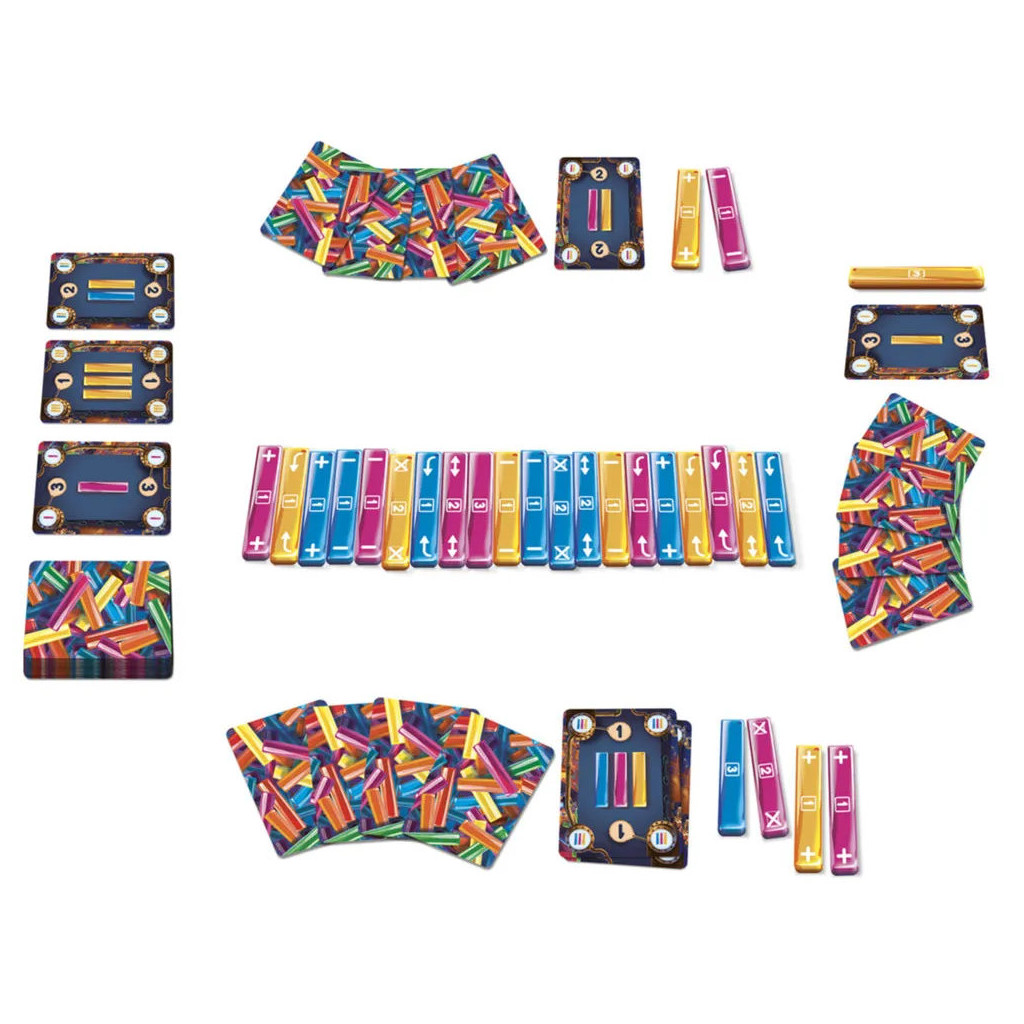 Contenu : 27 bâtonnets sucre d’orge (3 couleurs, 9 de chaque) – 42 cartes Commandes – 4 cartes aide de jeu – 1 carte Sucre d’or – 1 livret de règles.