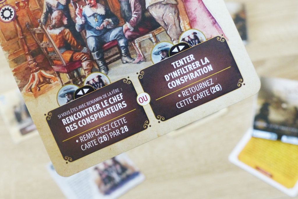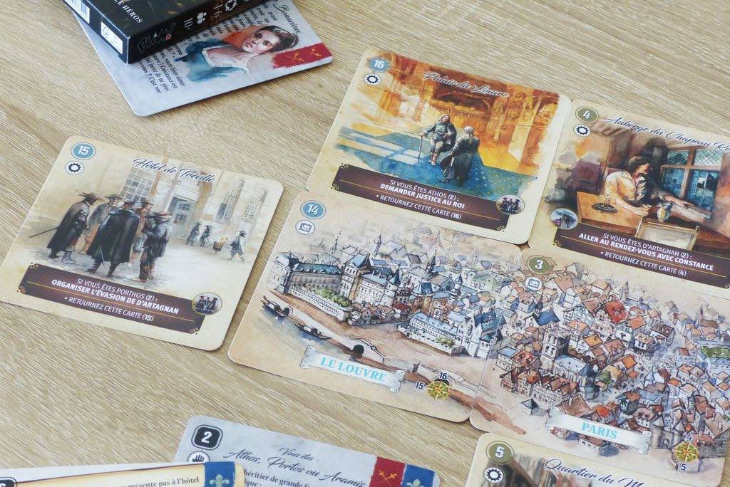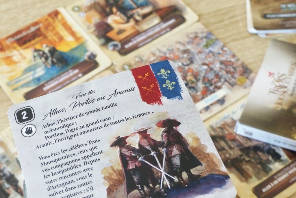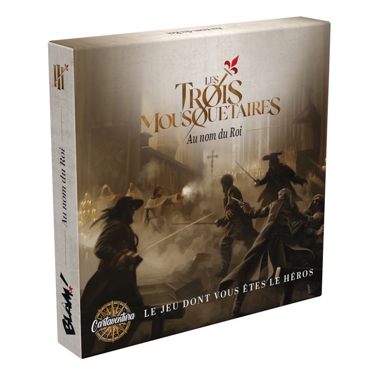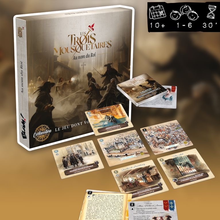 « Les Trois Mousquetaires » est une déclinaison spéciale de la gamme Cartaventura, vendue à plus de 300 000 exemplaires dans le monde. Cartaventura propose des aventures historiques au format poche, façon « Livre dont vous êtes le héros ». Les joueurs construisent leur aventure à l’aide de cartes qui proposent différentes options. Ils réfléchissent ensemble aux meilleurs choix afin de suivre la trace du héros du jeu. Grâce à des scénarios riches et de magnifiques illustrations à l’aquarelle, ils sont véritablement immergés dans différentes époques de l’Histoire. Le système de jeu, simple et inédit, permet de rejouer chaque scénario plusieurs fois afin de découvrir toutes les fins possibles. Dans Les Trois Mousquetaires – Au nom du Roi, découvrez 4 fins différentes, dont 3 alternatives au film !
