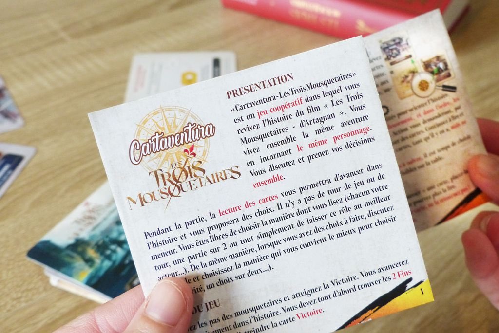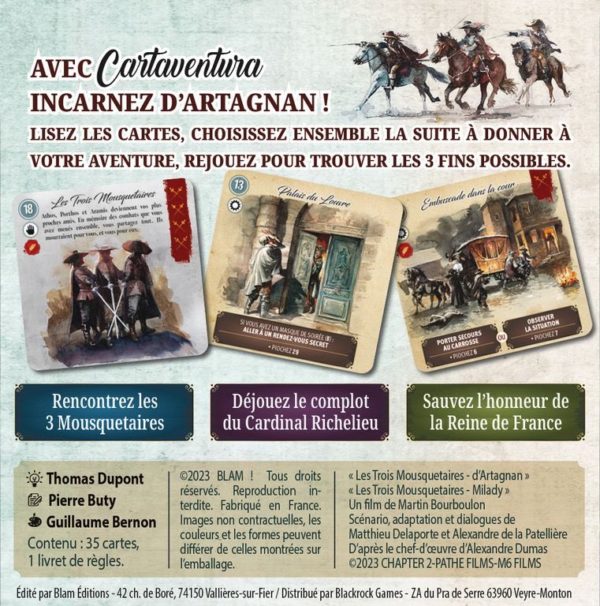 « Les Trois Mousquetaires » est une déclinaison spéciale de la gamme Cartaventura, vendue à plus de 300 000 exemplaires dans le monde. Cartaventura propose des aventures historiques au format poche, façon « Livre dont vous êtes le héros ». Les joueurs construisent leur aventure à l’aide de cartes qui proposent différentes options. Ils réfléchissent ensemble aux meilleurs choix afin de suivre la trace du héros du jeu. Grâce à des scénarios riches et de magnifiques illustrations à l’aquarelle, ils sont véritablement immergés dans différentes époques de l’Histoire. Le système de jeu, simple et inédit, permet de rejouer chaque scénario plusieurs fois afin de découvrir toutes les fins possibles. Dans Les Trois Mousquetaires – Au nom du Roi, découvrez 4 fins différentes, dont 3 alternatives au film !
