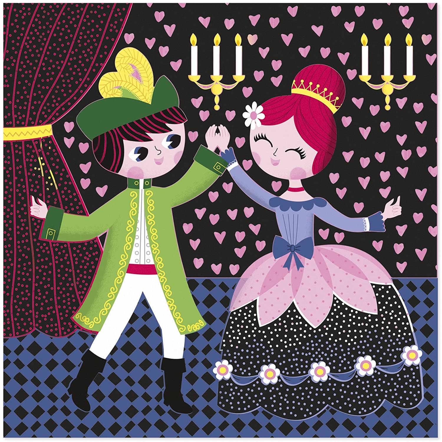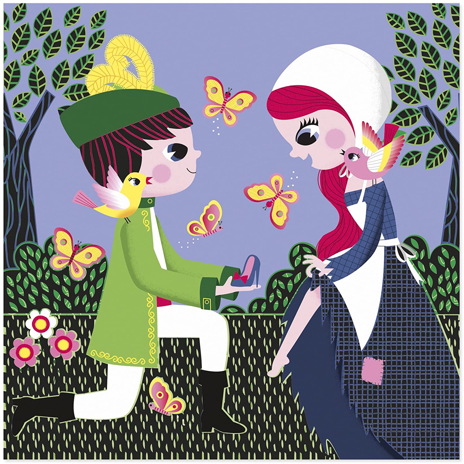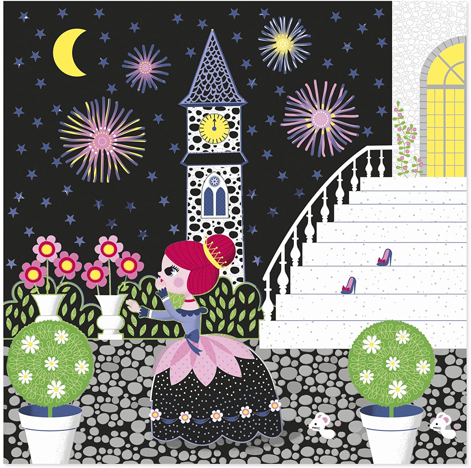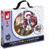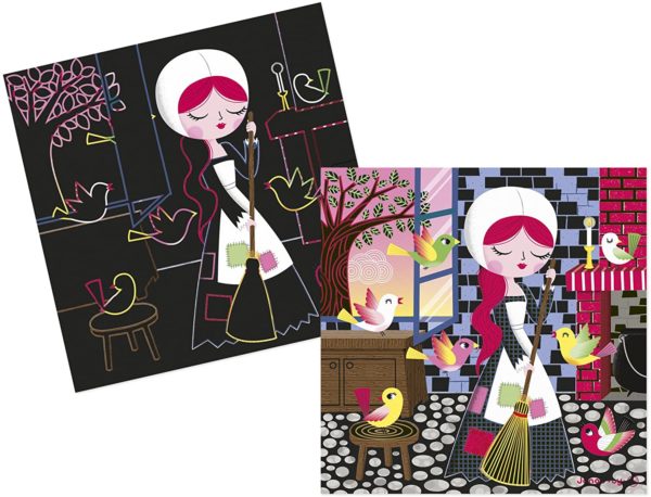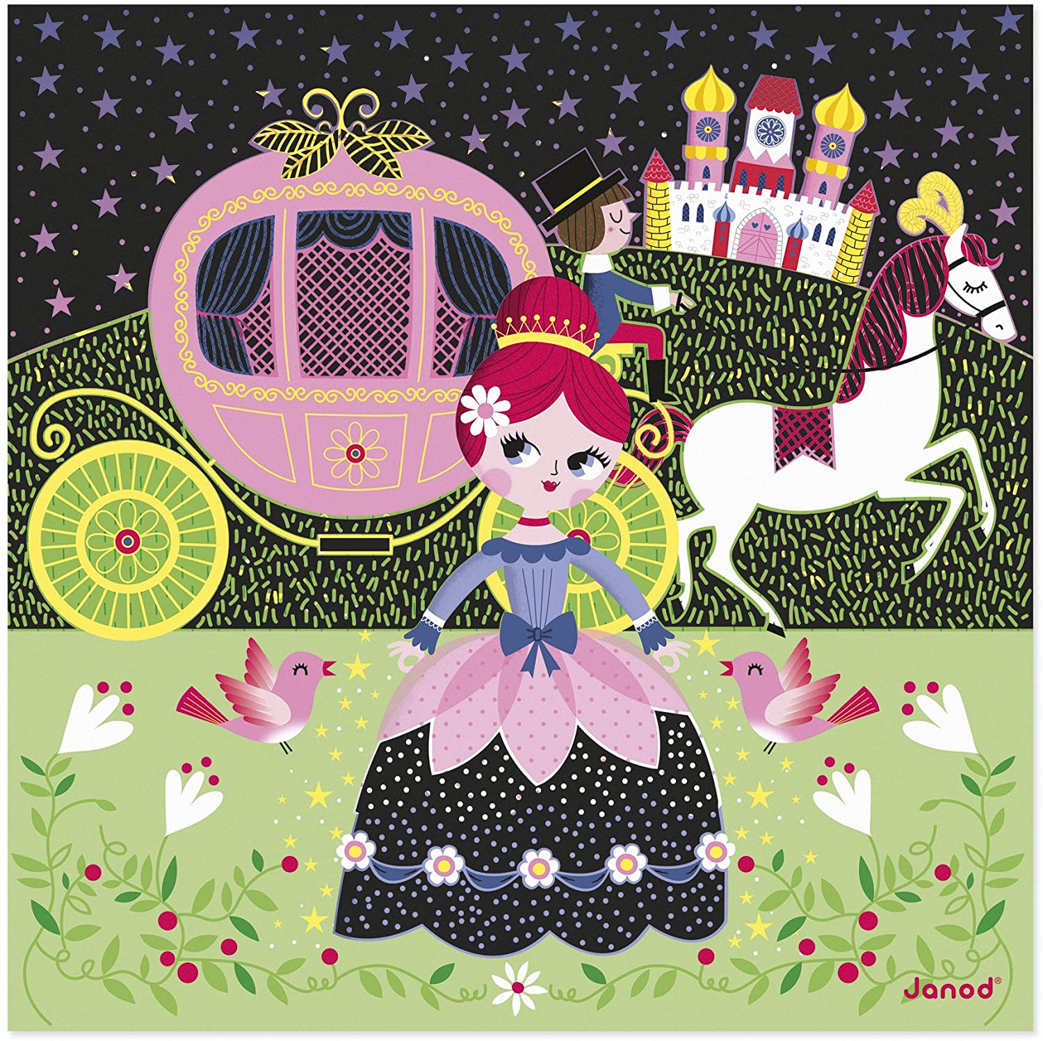 Les Valisettes « L’Atelier Janod » proposent des activités créatives tendance et variées. Cette activité basée sur le conte Cendrillon permet de réaliser 6 jolis tableaux. En suivant le modèle, il suffit de gratter les zones noires grâce à un stylet en bois pour laisser apparaître différentes scènes illustrant l’histoire de la princesse.