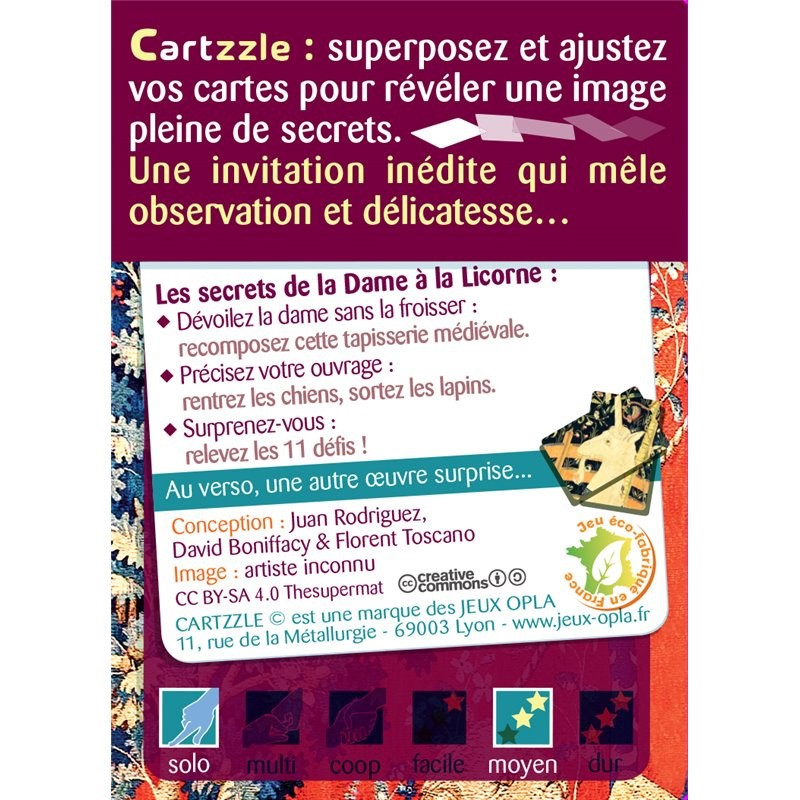 Cartzzle est une nouvelle collection de puzzles revisités composés de cartes. Avec une excellente rejouabilitè. Le but : Recomposer une oeuvre en superposant partiellement les cartes dans le bon angle … Puis, refaites-le en relevant les défis afin de résoudre les mystères de l’œuvre ! Un nouveau concept de puzzle et jeux revisité passionnant.