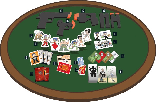 Contenu : 4 Pistolets en mousse (1 Desert Sparrow , 1 Stun Gun, 1 Silencieux et 1 Pistolet à Grappin) – 7 Personnages – 7 socles en plastique – 1 tuile échange dans l’Ombre – 1 tuile Recrutement d’un Mercenaire – 4 cartes Pouvoir – 2 cartes Evil Twin – 3 cartes Surprise – 8 cartes Balle – 4 jetons Enveloppe – 12 tuiles Mercenaire – Les règles de jeu.