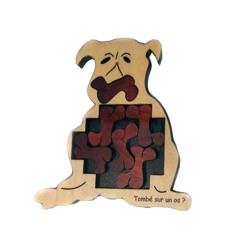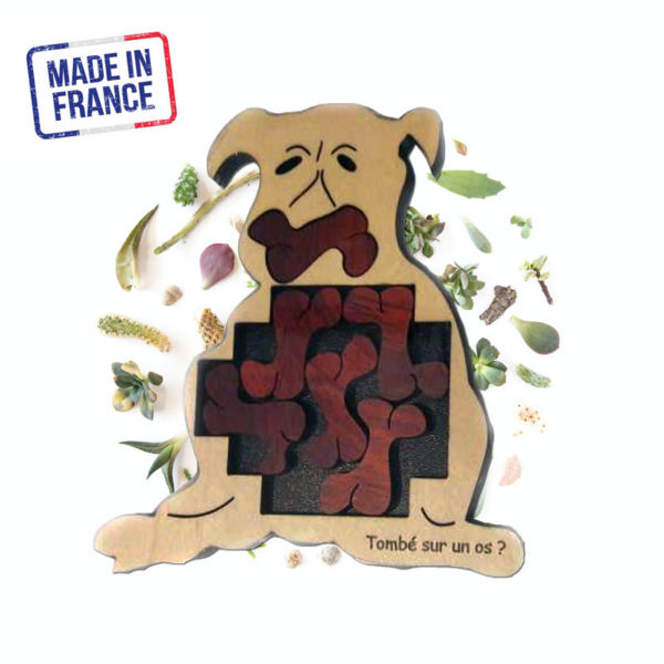Ce Casse-tête Chien, niveau moyen est de fabrication française. un puzzle constitué de 5 os à replacer dans le cadre représentant le corps du chien. Dès 8 ans.