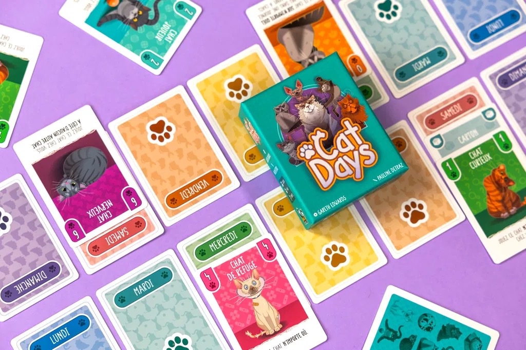 Dans le jeu Cat Days, vous affrontez votre adversaire dans une course féline pleine de rebondissements ! À chaque tour, piochez une carte ou jouez-en une pour compléter votre semaine. Certains chats exigent des jours spécifiques, d’autres doivent être posés près de congénères ou peuvent s’inviter dans la semaine adverse.Les cartes Événement viennent bouleverser les plans, permettant d’échanger, de subtiliser ou de défausser des chats. Dès qu’un joueur a placé un chat sur chacun des sept jours de la semaine, la partie se termine et le score est comptabilisé.Disposez 7 cartes Jour devant vous pour constituer votre semaine. Le but du jeu est de cumuler le plus de points en posant un chat sur chacun de ces jours.