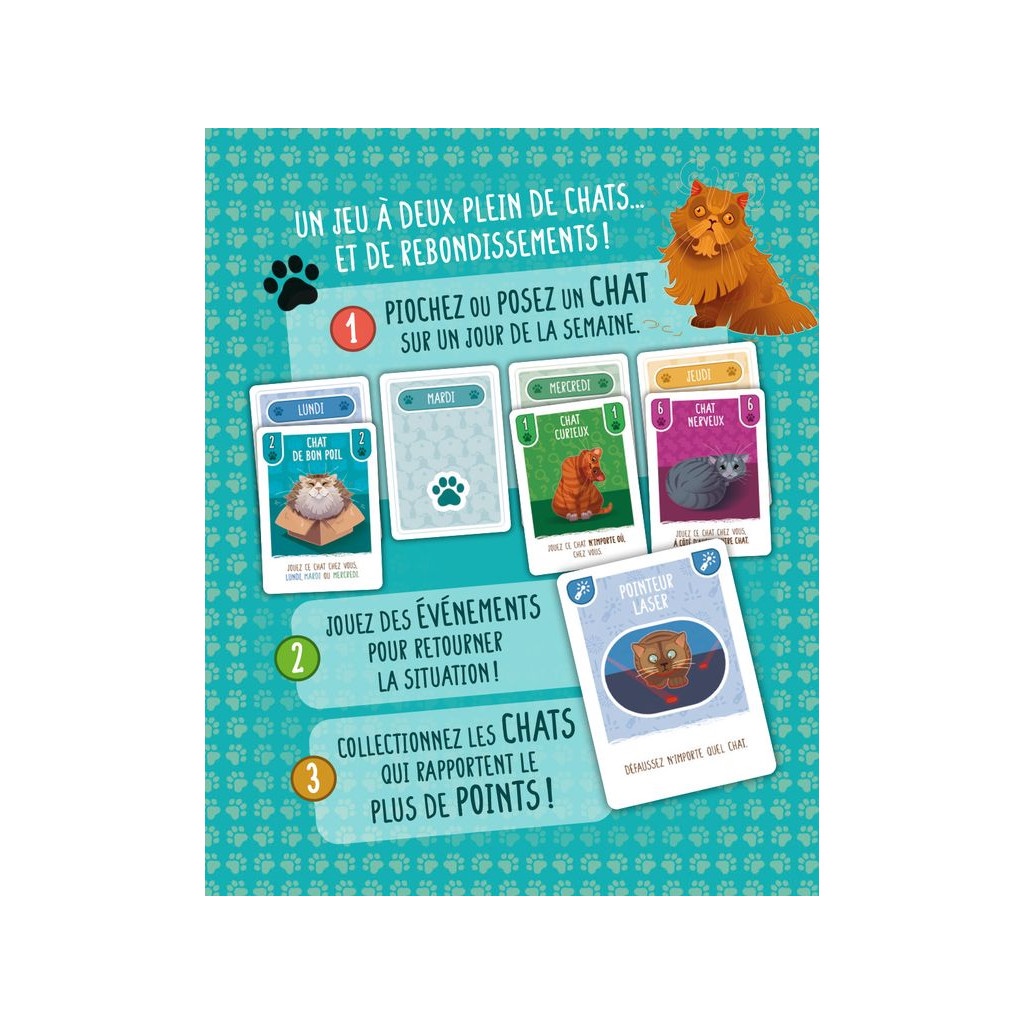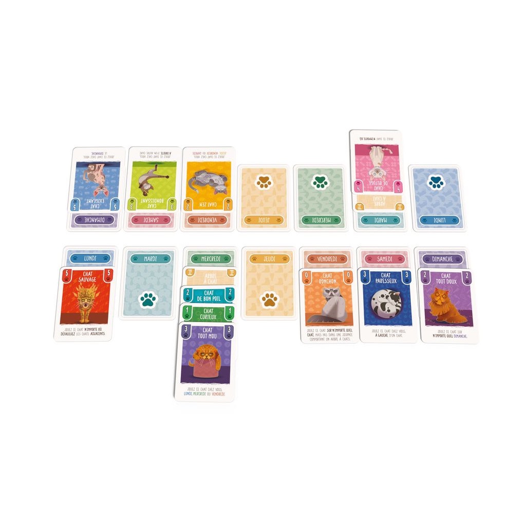 À votre tour, piochez une carte ou posez un chat sur un jour libre de votre semaine : certains ne peuvent être joués que sur des jours précis, ou adjacents à un congénère spécifique, pendant que d’autres peuvent être posés dans la semaine de votre adversaire. Enfin, vous pourrez tirer profit des cartes Événement pour subtiliser, défausser ou échanger des chats, et retourner ainsi la situation à votre avantage ! L’arbre à chats, une carte spéciale, permet même d’accueillir plusieurs félins sur un seul jour ! Le jeu se déroule en tours rapides : pioche ou pose d’un chat. Les félins peuvent parfois recouvrir un autre, bloquer un jour précis ou interagir avec la semaine adverse.