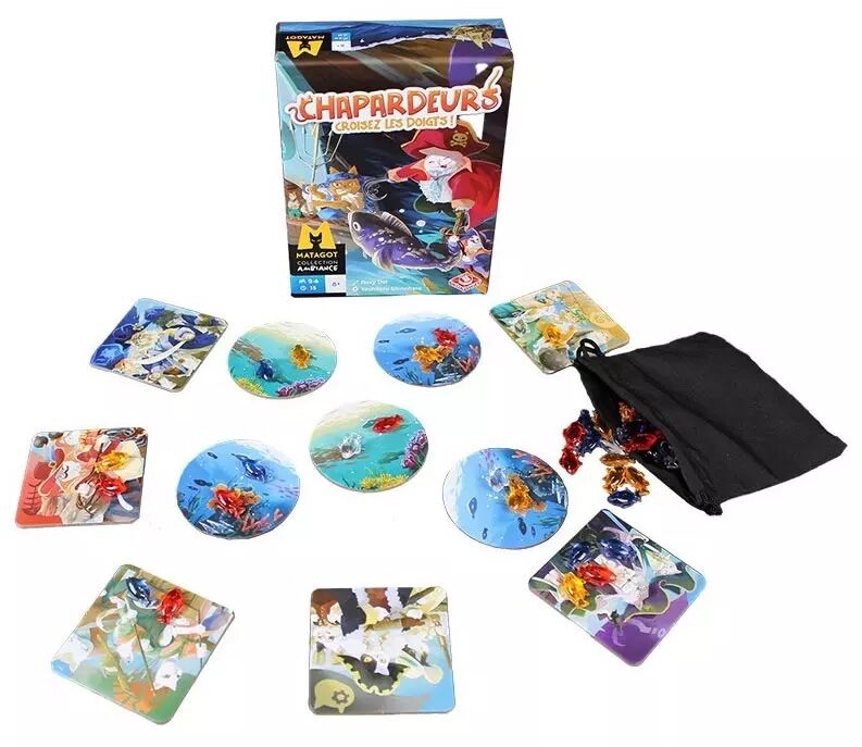 Enfin la réedition du grand classique Crossing ! Mais dans l’univers des océans, pointez, ramassez, volez les poissons des chat-pirates… Chapardeurs est un jeu de société mêlant bluff, intuition et prise de risque  Dans ce jeu de collection qui se joue en simultané, vous tenterez de mettre la mains sur les meilleurs poissons en tentant de deviner les intentions de vos adversaires et d’être plus rusé qu’eux.