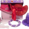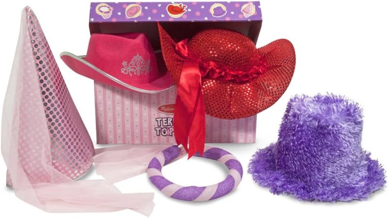 Ce magnifique ensemble comprend cinq chapeaux de jeu de cinq modèles fabuleux : princesse, western, renaissance, glamour et peluche lavande insolite ! Chacun d’eux est prêt à inspirer l’imagination et est de fabrication durable. De taille adaptée aux enfants âgés de trois à six ans, cet ensemble excentrique constitue un excellent cadeau… et la façon parfaite de briser la glace lors des réceptions et avec les compagnons de jeu ! Lorsque le temps de jeu théâtral est terminé, toute la collection se range proprement dans le coffre de rangement.