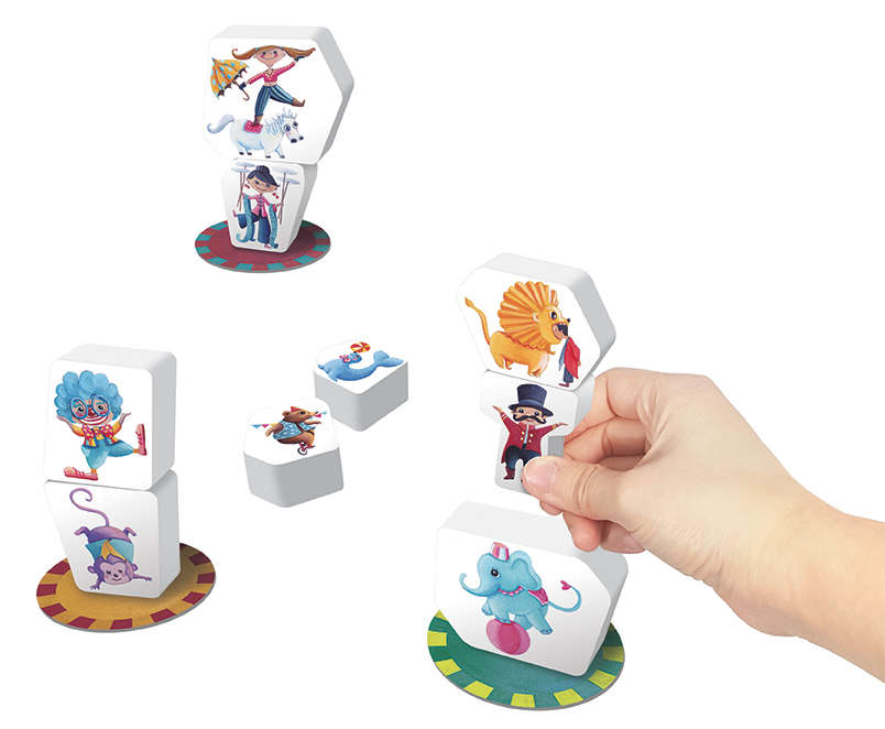 Chapito… Le cirque Chapito débarque en ville ! Acrobates, clowns et animaux : tout le monde est prêt. A leur tour les joueurs posent ou déplacent des personnages pour tenter de reproduire la disposition d’une de leurs cartes. Mais attention il faut garder l’équilibre pour ne pas faire tomber tout ce petit monde !