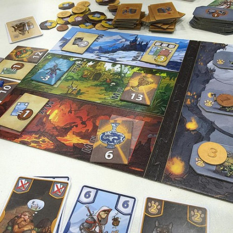 Chaque joueur va donc révéler toutes ses cartes liées à ce premier lieu puis on va faire le total des valeurs et le plus puissant gagne le trésor le plus intéressant, le plus faible gagne le trésor le plus faible, les autres rien du tout. Il nous est aussi possible de jouer des cartes action qui permettra de modifier sa valeur total.