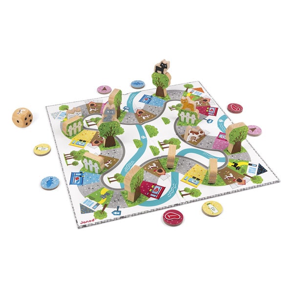Chat perché  de Janod est un jeu de parcours. Incarnez un chat et soyez à la fois rapide et agile. Il faut être le chat le plus rapide du quartier et rapporter autant de nourriture que possible sans se faire détrousser par le chien qui rôde !