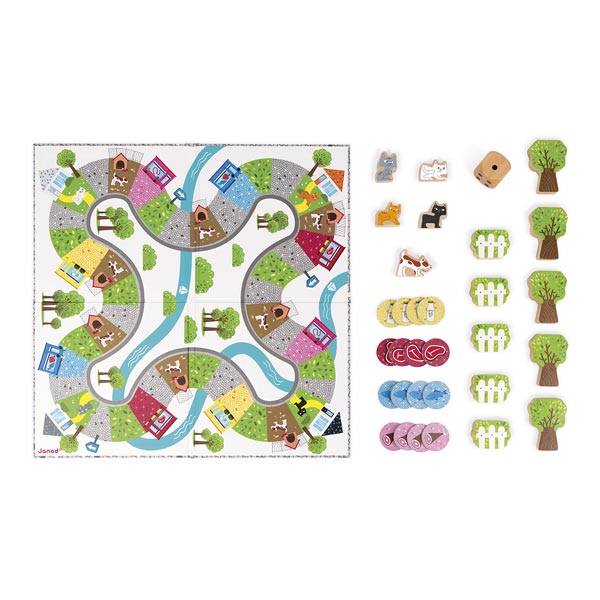 Contenu : 1 Plateau de jeu, 15 pièces en bois, 16 jetons aliments en carton (4 viandes, 4 poissons, 4 jambons et 4 bouteilles de lait), 1 pion chien, 5 arbres, 4 pions chats – 5 haies, et un dé en bois.