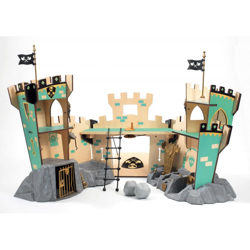 Le château des chevaliers Castle on Ze Rock de la gamme Arty Toys en bois modulable, est le château idéal pour jouer avec ses propres figurines. Le pont-levis s’actionne réellement pour laisser entrer les chevaliers. Les deux tours permettent de surveiller l’arrivée des ennemis, qui finiront enfermés au cachot. On peut choisir de fermer le château ou bien de le déployer tout en longueur, en forme de rempart. Un décor idéal pour de belles histoires de chevaliers.